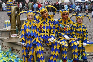 Dann geht es mit Musik und "Narri und Narro" durch die Straßen bis zum Einmarsch auf dem Marktplatz an dem nun die Bajasstaufe der "Neuen" stattfindet.