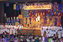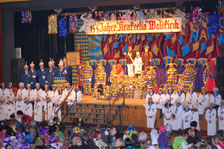 In fasnächtlicher Bekleidung sitzen die Zuschauer an langen Tischen und harren der Dinge, die da kommen werden. Schon hat die Stadtmusik von der Empore aus das Publikum eingestimmt.
